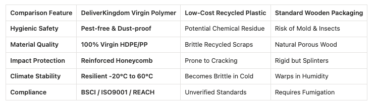 Itu DeliverKingdom High-Integrity Sleeve Pack DeliverKingdom dirancang khusus untuk industri di mana kontaminasi produk dan kerusakan selama transit bukan hanya risiko, tetapi juga kegagalan kritis. Solusi pengemasan tradisional, seperti peti kayu atau wadah plastik daur ulang berkualitas rendah, seringkali membahayakan keamanan kargo karena serpihan kayu, hama, kelembapan, atau bau bahan kimia. DeliverKingdom mengatasi kerentanan ini dengan memanfaatkan teknologi pengemasan yang lebih baik. Polimer berdampak tinggi (HDPE & PP) murni 100% untuk menciptakan lingkungan bebas kontaminan dan tahan debu. Hal ini memastikan bahwa perlengkapan medis bernilai tinggi, elektronik sensitif, dan komponen kelas makanan tetap dalam kondisi prima dari ruang bersih manufaktur hingga tujuan global, memberikan perusahaan sarana logistik yang andal dan sesuai dengan standar ISO9001.